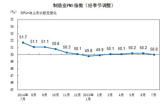 中國物流與采購聯(lián)合會、國家統(tǒng)計局服務業(yè)調(diào)查中心發(fā)布的2015年7月份中國制造業(yè)采購經(jīng)理指數(shù)(PMI)為50.0%,比上月下降0.2個百分點。從12個分項指數(shù)來看,同上月相比,供應商配送時間、生產(chǎn)經(jīng)營活動預期指數(shù)略有上升;生產(chǎn)、新訂單、出口、積壓訂單、采購量、進口、購進價格、原材料庫存、從業(yè)人員指數(shù)小幅下降。其中,購進價格指數(shù)降幅較為明顯,下降2.6個百分點。