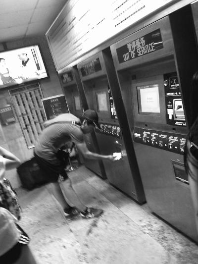 在B進站口處,有一名專門負(fù)責(zé)從售票機買票的戴帽子男子,他先是混在人群里,到人工售票口排隊買票,但并沒有從售票窗口買出票來,于是他到自動售票機前,先用一些硬幣買出幾張票,又拿出一張紙幣投進去,但是嘗試了幾次都沒買出票。這時候,一名大個子地鐵工作人員向他大喊,男子馬上跑向站外。