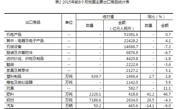 五、機(jī)電產(chǎn)品出口增長,傳統(tǒng)勞動密集型產(chǎn)品有所下降。前8個月,我國機(jī)電產(chǎn)品出口5.11萬億元,增長0.7%,占出口總值的57%。其中,電器及電子產(chǎn)品出口2.24萬億元,增長4.1%;機(jī)械設(shè)備1.47萬億元,下降7.3%。同期,服裝出口6876.9億元,下降6.7%;紡織品4420.8億元,下降1.8%;鞋類2222.6億元,下降3.4%;家具2127.2億元,增長5.1%;塑料制品1496.4億元,增長1.8%;箱包1142億元,增長5.9%;玩具582.7億元,增長11.1%;上述7大類勞動密集型產(chǎn)品合計出口1.89萬億元,下降2.1%,占出口總值的21.1%。此外,肥料出口2226.1萬噸,增加41.2%;鋼材7186.6萬噸,增加26.5%;汽車50.2萬輛,減少14.1%(表2)。