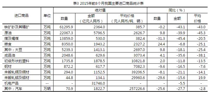 六、原油、糧食、成品油等主要大宗商品進(jìn)口量增加,主要進(jìn)口商品價格普遍下跌。前8個月,我國進(jìn)口鐵礦砂6.13億噸,微降0.2%,進(jìn)口均價為每噸385.7元,下跌43%;原油2.21億噸,增加9.8%,進(jìn)口均價為每噸2626.7元,下跌45.3%;煤1.39億噸,減少31.3%,進(jìn)口均價為每噸382.4元,下跌20.5%;成品油2048.6萬噸,增加4.1%,進(jìn)口均價為每噸3073.4元,下跌38.1%;初級形狀的塑料1735.8萬噸,增加2%,進(jìn)口均價為每噸1.08萬元,下跌13.5%;鋼材872.2萬噸,減少9.6%,進(jìn)口均價為每噸7082.3元,下跌7.6%;未鍛軋銅及銅材294萬噸,減少8.1%,進(jìn)口均價為每噸3.92萬元,下跌14.1%。
