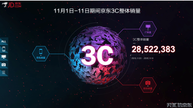 2015年11月12日,京東雙11大促收官。自11月1日至11日24點,京東3C品類總銷量為28,522,383臺。其中,京東手機總銷量達2,874,031臺,電腦辦公品類總銷量達14,335,143臺、數(shù)碼品類總銷量達11,313,209臺。