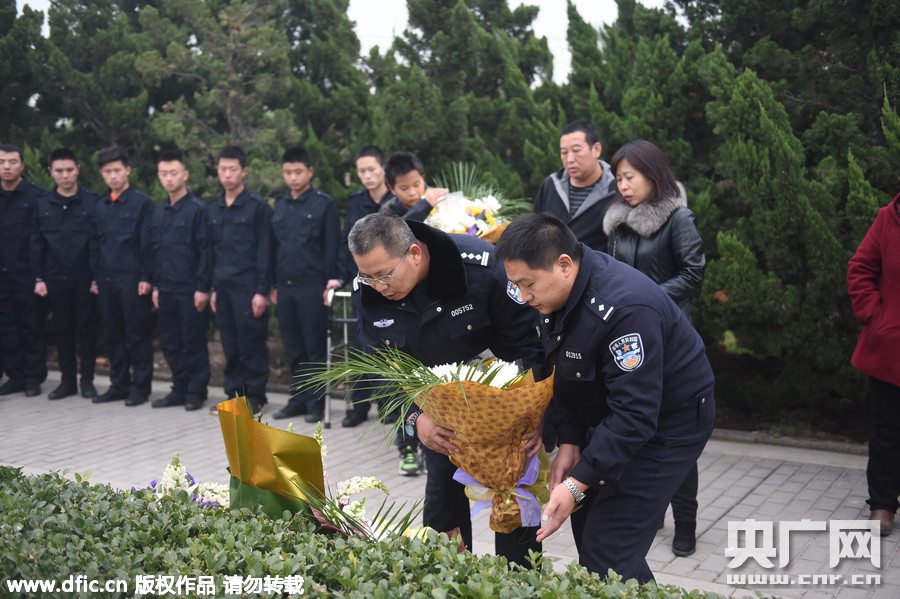 2015年11月19日,天津,天津濱海新區(qū)“8·12”爆炸事故發(fā)生整一百天,犧牲消防員的家屬、同事,武警戰(zhàn)士、公安及其他社會人士來到塘沽烈士陵園舉行祭奠活動。
