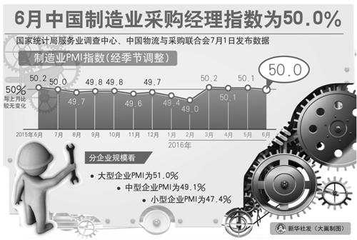 今天上午,國(guó)家統(tǒng)計(jì)局發(fā)布了今年6月份中國(guó)制造業(yè)采購(gòu)經(jīng)理人指數(shù)PMI數(shù)值為50.0%,比上月微降0.1個(gè)百分點(diǎn),位于臨界點(diǎn)。