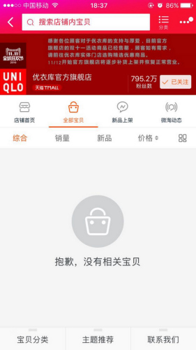 記者11日18:37瀏覽時(shí)看到,優(yōu)衣庫天貓店公告稱,“雙11”活動(dòng)商品已經(jīng)售罄。