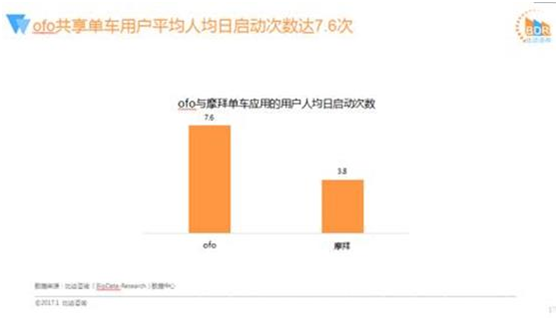 根據(jù)今年2月份剛剛出爐的統(tǒng)計數(shù)據(jù),ofo是以51.2%市場占有率位居行業(yè)第一,用戶活躍度達到了市場第二的Mobike的兩倍,成為最后一公里出行市場的領(lǐng)頭羊。ofo做到了人居日啟動7.6次,排到第二名的Mobike比它差了一半,日均只有3.8次,這是這幾家公司的規(guī)模及市場占有率。