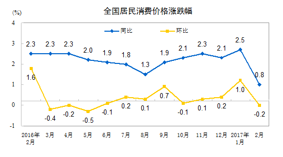 2017年2月份,全國居民消費價格總水平同比上漲0.8%。其中,城市上漲0.9%,農(nóng)村上漲0.6%;食品價格下降4.3%,非食品價格上漲2.2%;消費品價格下降0.1%,服務價格上漲2.4%。1-2月平均,全國居民消費價格總水平比去年同期上漲1.7%。