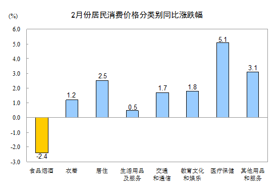 2月份,其他七大類價格同比均有所上漲。其中,醫(yī)療保健、其他用品和服務、居住、教育文化和娛樂、交通和通信、衣著、生活用品及服務價格分別上漲5.1%、3.1%、2.5%、1.8%、1.7%、1.2%和0.5%。