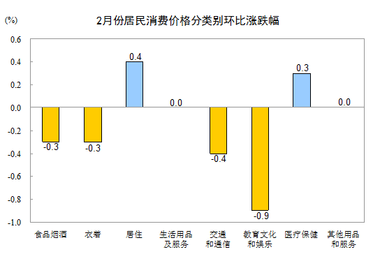 2月份,全國居民消費價格總水平環(huán)比下降0.2%。其中,城市下降0.2%,農(nóng)村下降0.1%;食品價格下降0.6%,非食品價格下降0.1%;消費品價格下降0.1%,服務價格下降0.3%。