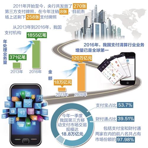 支付行業(yè)自身也在謀求轉型。第三方易觀最新統(tǒng)計數據顯示,今年一季度,我國第三方移動支付市場交易規(guī)模達18.8萬億元,其中支付寶占比53.7%,財付通為39.51%,包括支付寶和財付通兩家在內的前八名共占有市場份額的97.98%。