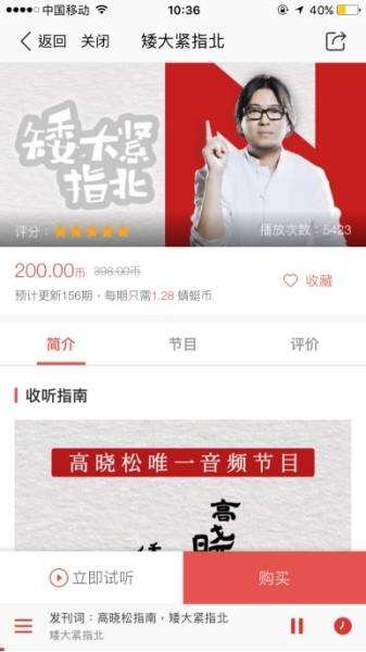 6月12日,蜻蜓FM推出《矮大緊指北》,一檔由高曉松聊"詩(shī)與遠(yuǎn)方"的音頻付費(fèi)節(jié)目火了。此前,《曉說(shuō)》、《曉松奇談》等節(jié)目為高曉松積累了一票粉絲,已然成為具有號(hào)召力的強(qiáng)勢(shì)IP。此前,蜻蜓FM上線的高曉松免費(fèi)音頻,累計(jì)播放量達(dá)9億。這些前期的免費(fèi)內(nèi)容已經(jīng)為高曉松的IP質(zhì)量打下了基礎(chǔ),粉絲不需要擔(dān)心購(gòu)買(mǎi)的內(nèi)容是不是自己所需要的,不需要戰(zhàn)戰(zhàn)兢兢擔(dān)心內(nèi)容質(zhì)量是否優(yōu)秀且穩(wěn)定,高曉松提供的知識(shí)+情懷已經(jīng)順理成章的從免費(fèi)走向付費(fèi)。