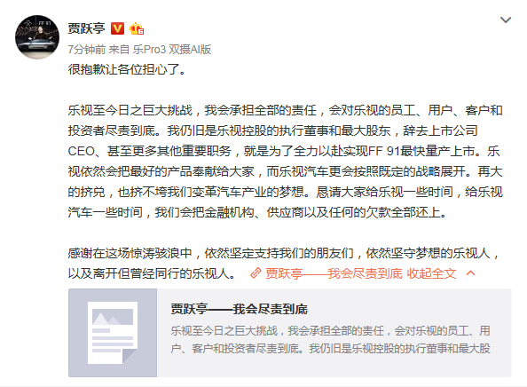 賈躍亭在微博上表示:樂視至今日之巨大挑戰(zhàn),我會承擔全部的責任,會對樂視的員工、用戶、客戶和投資者盡責到底。我仍舊是樂視控股的執(zhí)行董事和最大股東,辭去上市公司CEO、甚至更多其他重要職務,就是為了全力以赴實現(xiàn)FF 91最快量產(chǎn)上市。樂視依然會把最好的產(chǎn)品奉獻給大家,而樂視汽車更會按照既定的戰(zhàn)略展開。再大的擠兌,也擠不垮我們變革汽車產(chǎn)業(yè)的夢想。懇請大家給樂視一些時間,給樂視汽車一些時間,我們會把金融機構、供應商以及任何的欠款全部還上。