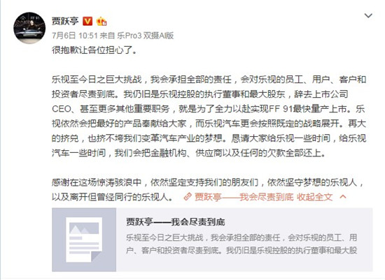 7月6日上午,樂視控股CEO、樂視網(wǎng)董事長賈躍亭發(fā)布一封個人聲明,其在聲明中稱,"會對樂視的員工、用戶、客戶和投資者盡責(zé)到底。"而之所以辭去上市公司CEO,目的在于"全力以赴實現(xiàn)FF 91最快量產(chǎn)上市",同時,"懇請大家給樂視一些時間,給樂視汽車一些時間,我們會把金融機構(gòu)、供應(yīng)商以及任何的欠款全部還上"。