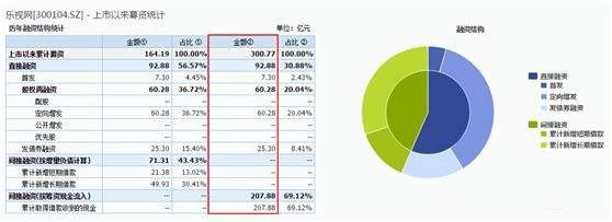 Wind資訊統(tǒng)計顯示,自2010年上市以來的近七年時間里,樂視網(wǎng)累計融資300.77億元,其中直接融資92.89億元,占總?cè)谫Y額30.88%;間接融資207.88億元,占總?cè)谫Y額69.12%。
