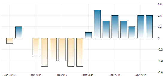 在日本央行經(jīng)濟季度展望報告中,上調(diào)了2017-2019財年的GDP增速預(yù)測,分別至1.8%、1.4%和0.7%。日本財務(wù)省公布最新貿(mào)易數(shù)據(jù)顯示,日本6月重回貿(mào)易順差,進出口持續(xù)強勁增長。出口同比增長9.7%,連續(xù)7個月保持增長,其中對中國出口同比大漲19.5%,對美國增長7.1%,對歐盟出口增長9.6%。另外,進口同比增長15.5%,高于預(yù)期值14.4%。