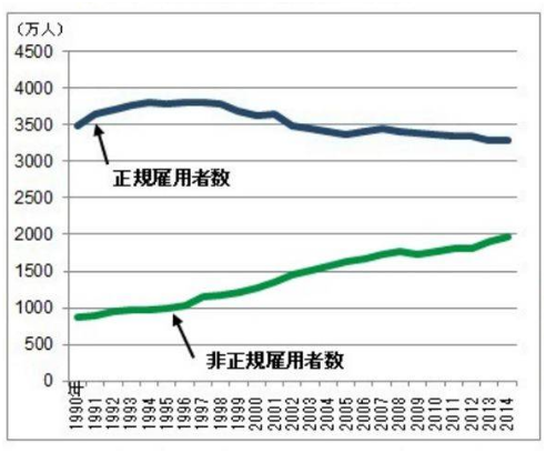 二戰(zhàn)后,日本勞動力極度緊缺,企業(yè)由于懼怕勞動力流失,極力吸引員工,形成了終身雇傭制,也就是所謂的“正式工”,正式工工作穩(wěn)定,基本上沒有“丟飯碗”的擔(dān)憂,而且享有許多福利。這種終身雇傭制已經(jīng)根植于日本社會,而在日本泡沫經(jīng)濟崩潰后,經(jīng)濟衰退企業(yè)需要裁員,然而日本全社會對于裁員的抵觸程度比其他國家高得多,企業(yè)一旦裁員勢必會引來全社會的口誅筆伐,同時還要按照員工的工作年限給付高昂的退職金。因此,企業(yè)就開始大量的增加派遣制的非正規(guī)雇傭員工。自上世紀(jì)90年代以來,日本的正式工人數(shù)一直在下降,而派遣制員工數(shù)量則一路攀升。