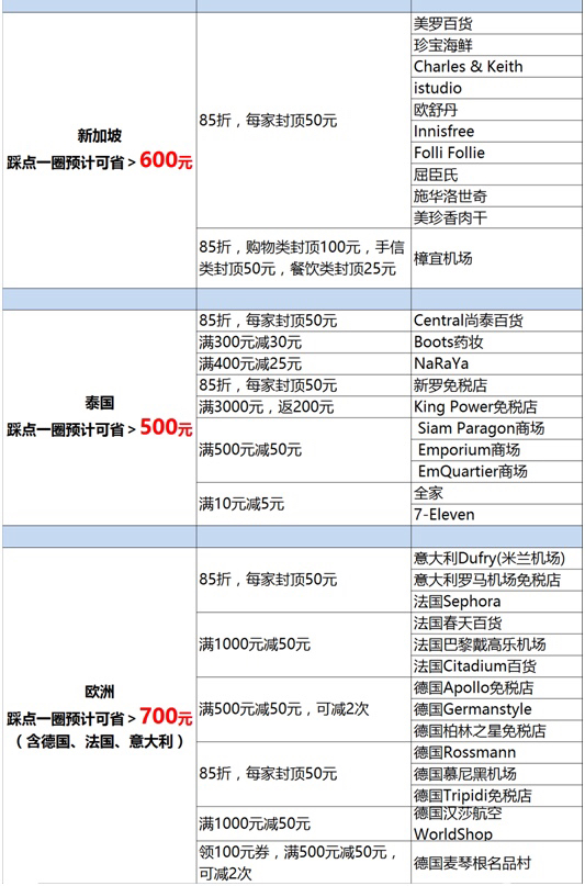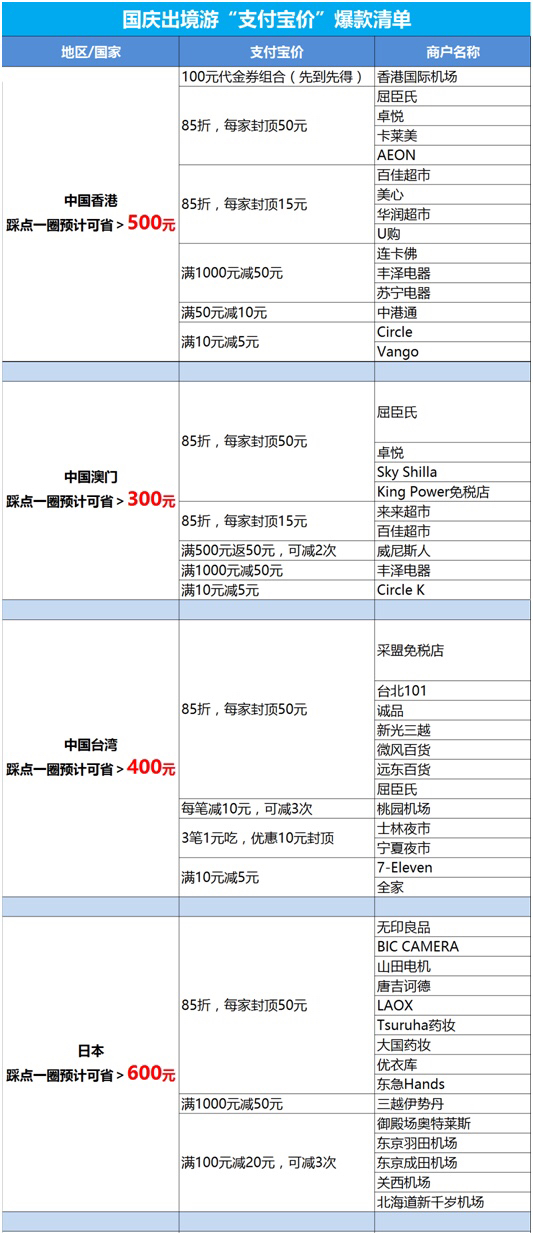 以港澳臺(tái)、日韓、以泰國(guó)、新加坡為代表的東南亞各國(guó),素來是中國(guó)人出境游的熱門目的地。據(jù)統(tǒng)計(jì),在這些國(guó)家和地區(qū),國(guó)人最常去的商家中,起碼有超過七成的商家,都向中國(guó)游客推出支付寶價(jià)。每家每鋪的優(yōu)惠力度各不相同,最主流的方式就是八五折(50元封頂),且不同品牌店鋪之間的優(yōu)惠可以疊加。