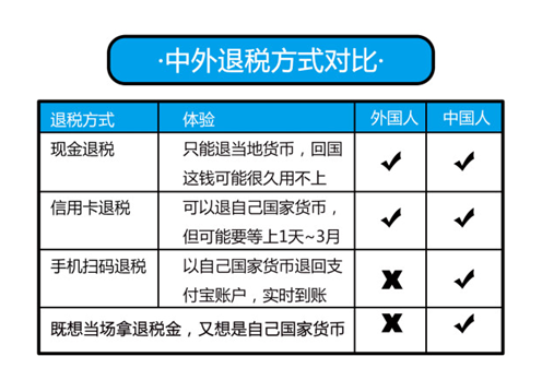 現(xiàn)金退稅是退回當(dāng)?shù)刎泿,最大的問題是當(dāng)?shù)貛艓Щ貒?guó)可能會(huì)無用武之地;而信用卡退稅,游客可以拿到自己國(guó)家的貨幣,但是,一般要等候三五天時(shí)間,不像現(xiàn)金退稅這樣可以當(dāng)場(chǎng)“落袋為安”,用手機(jī)退稅一秒到賬,收到的是人民幣。