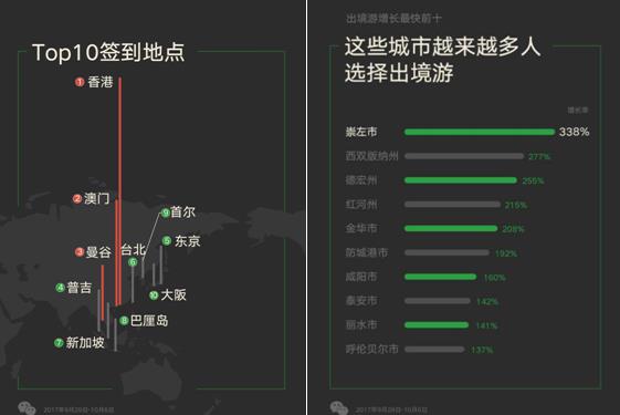 但隨著收入的提升和消費升級,出境游已成為越來越多二三線城市居民的度假選擇,微信的統(tǒng)計數(shù)據(jù)顯示,廣西、云南、陜西等省份的居民選擇出境旅游的人數(shù)也在快速上升,其中,廣西省崇左市微信用戶的出境人數(shù)增長率達338%。
