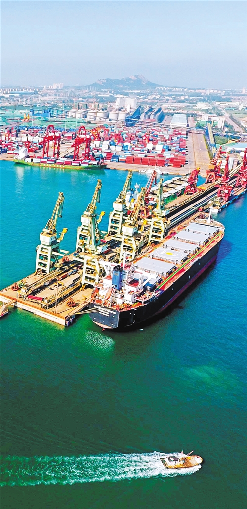 圖③ 這是2017年9月12日航拍的日照港。日照港搶抓“一帶一路”國家戰(zhàn)略機遇,先后開通“日照—中東”件雜貨班輪航線和“日照—中亞”集裝箱國際班列等。新華社記者 郭緒雷攝