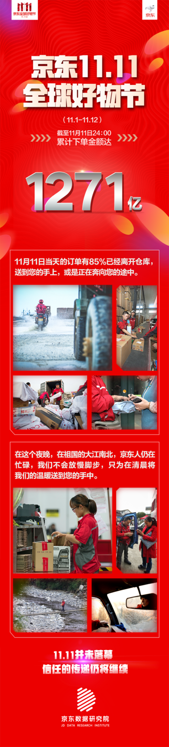 11月11日24時,京東11.11全球好物節(jié)(11月1日-12日)迎來又一個高潮,截至11日24時京東商城累計下單金額已超過1271億元。