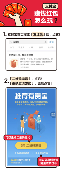 支付寶方面介紹,賺錢紅包沒有任何門檻,任何用戶都可以在支付寶首頁搜索“發(fā)紅包”,進入“免費發(fā)紅包,推薦有賞金”的頁面,將紅包通過吱口令、二維碼等方式分享給其他人。申請了收錢碼的小商家,也可以在支付寶“商家服務”功能中免費領取紅包碼海報,張貼在自己的門店。