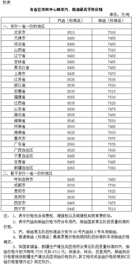 調(diào)整后,各省(區(qū)、市)和中心城市汽、柴油最高零售價格見附表。相關(guān)價格聯(lián)動及補貼政策按現(xiàn)行規(guī)定執(zhí)行。