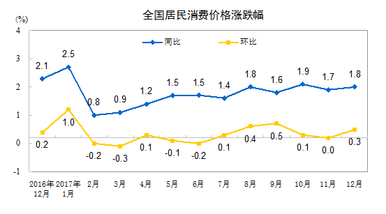 央廣網(wǎng)1月10日消息 國家統(tǒng)計(jì)局今日發(fā)布的數(shù)據(jù)顯示,2017年12月份,全國居民消費(fèi)價(jià)格同比上漲1.8%。其中,城市上漲1.9%,農(nóng)村上漲1.7%;食品價(jià)格下降0.4%,非食品價(jià)格上漲2.4%;消費(fèi)品價(jià)格上漲1.1%,服務(wù)價(jià)格上漲3.0%。