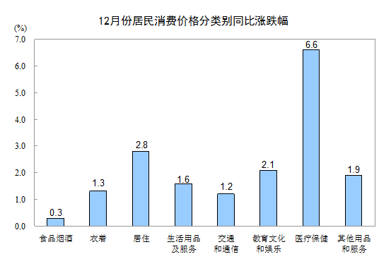 12月份,其他七大類價(jià)格同比均上漲。其中,醫(yī)療保健、居住、教育文化和娛樂價(jià)格分別上漲6.6%、2.8%和2.1%,其他用品和服務(wù)、生活用品及服務(wù)價(jià)格分別上漲1.9%和1.6%,衣著、交通和通信價(jià)格分別上漲1.3%和1.2%。