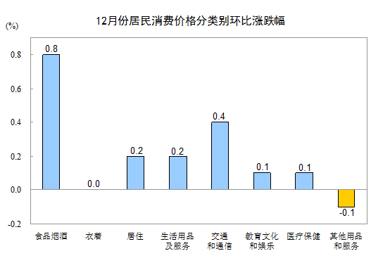 12月份,全國居民消費(fèi)價(jià)格環(huán)比上漲0.3%。其中,城市上漲0.3%,農(nóng)村上漲0.4%;食品價(jià)格上漲1.1%,非食品價(jià)格上漲0.1%;消費(fèi)品價(jià)格上漲0.5%,服務(wù)價(jià)格上漲0.1%。