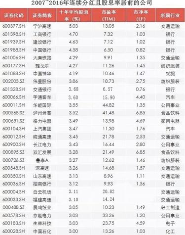 2007至2016年連續(xù)分紅且股息率居前的公司