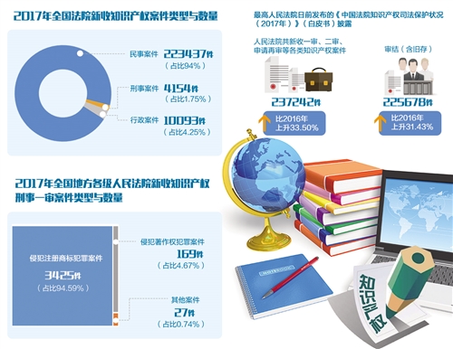 最高人民法院日前發(fā)布的《中國(guó)法院知識(shí)產(chǎn)權(quán)司法保護(hù)狀況(2017年)》(白皮書)披露,2017年,人民法院共新收一審、二審、申請(qǐng)?jiān)賹彽雀黝愔R(shí)產(chǎn)權(quán)案件237242件,審結(jié)225678件(含舊存),比2016年分別上升33.50%和31.43%。