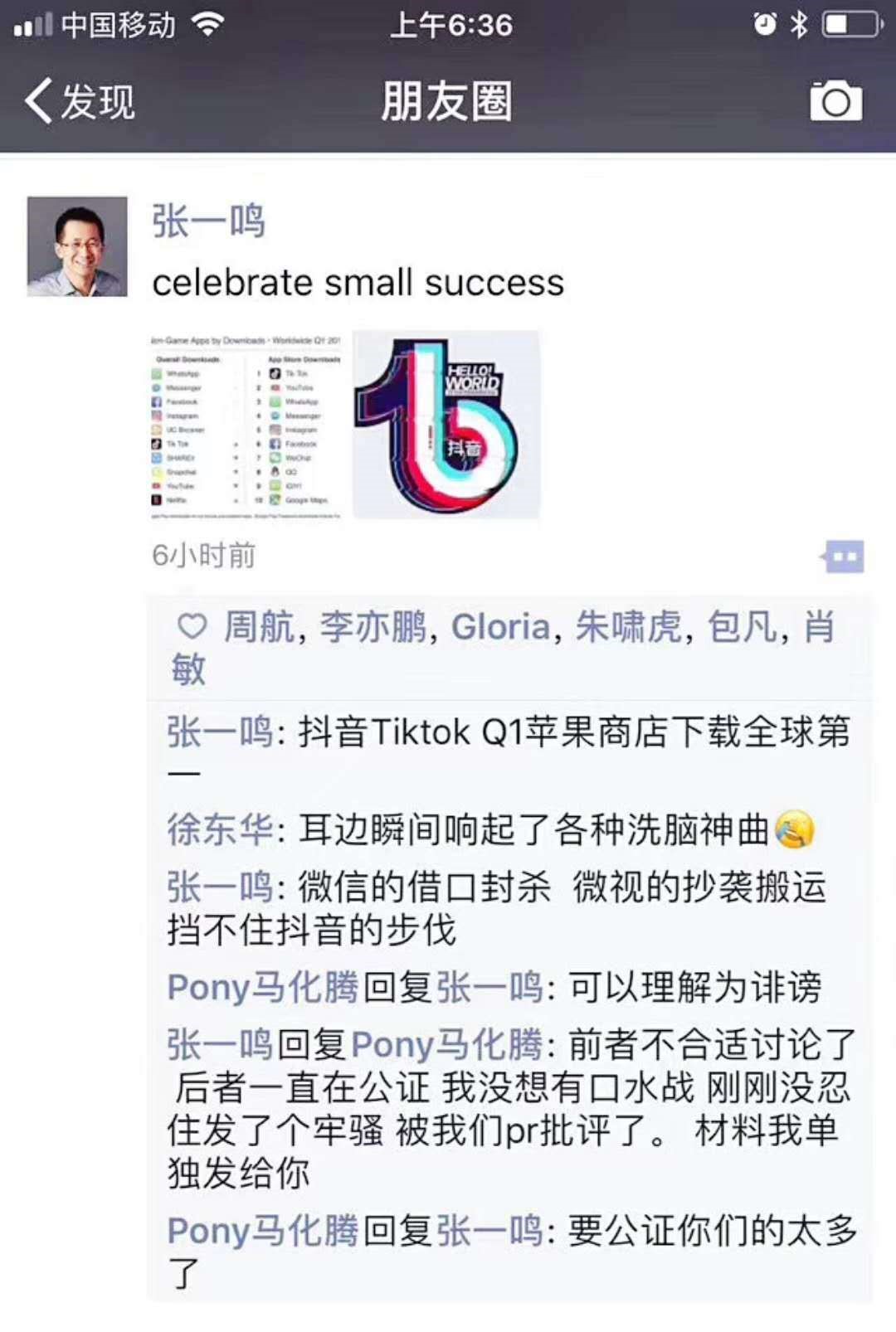 5月8日凌晨,張一鳴在朋友圈發(fā)文慶祝稱,抖音海外版Tiktok在蘋果商店取得全球下載第一。在該條朋友圈下,他說(shuō):"微信借口封殺,微視的抄襲搬運(yùn)擋不住抖音的步伐"。馬化騰則在留言下回復(fù)稱,"可以理解為誹謗"。