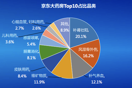 《報告》顯示,在京東大藥房TOP 10占比品類排行中,“補腎壯陽”排名第一,占比高達(dá)20.1%;在京東大藥房TOP 10增速品類排行中,“男性/泌尿”和“避孕用藥”等品類則分別占據(jù)了第一名和第二名。