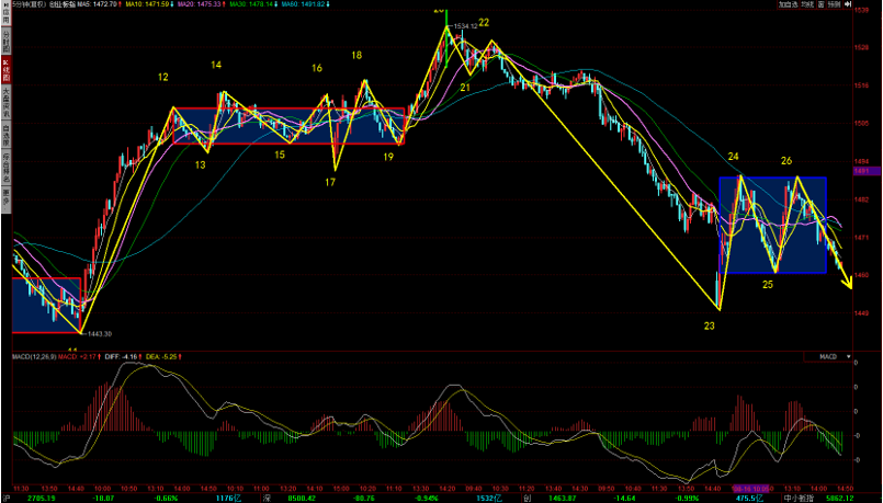 而對(duì)于創(chuàng)業(yè)板指,近期明顯比上證指數(shù)要強(qiáng),但今天指數(shù)5分鐘形成了24號(hào)點(diǎn)三賣,有點(diǎn)偏弱,接下來(lái)創(chuàng)業(yè)板指也存在兩種可能演變,一種就是5分鐘類二買(mǎi)直接拉回12-15中樞,之后不創(chuàng)新低的二買(mǎi)就是短線機(jī)會(huì)。還有一種和上證指數(shù)類似,5分鐘形成中樞背馳,也就是短線反彈機(jī)會(huì)。