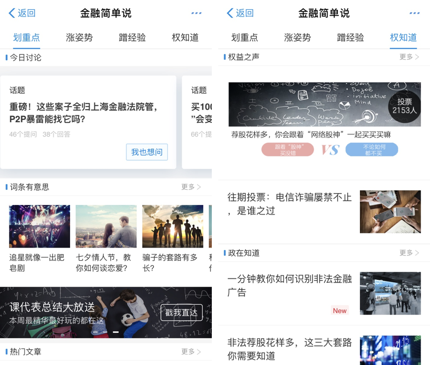 今年下半年以來,防范化解互聯(lián)網(wǎng)金融風(fēng)險(xiǎn)成為全社會(huì)關(guān)注的焦點(diǎn)問題,“金融簡單說”應(yīng)運(yùn)而生。據(jù)從支付寶介紹,這個(gè)知識(shí)平臺(tái)相當(dāng)于一個(gè)面向小白用戶的金融知識(shí)小課堂,不僅有防騙指數(shù)測試等趣味科普內(nèi)容,還設(shè)置了熱議、投票等環(huán)節(jié),集中收集消費(fèi)者關(guān)注的重點(diǎn)、盲點(diǎn)問題,與專業(yè)機(jī)構(gòu)合作提供權(quán)威解答。