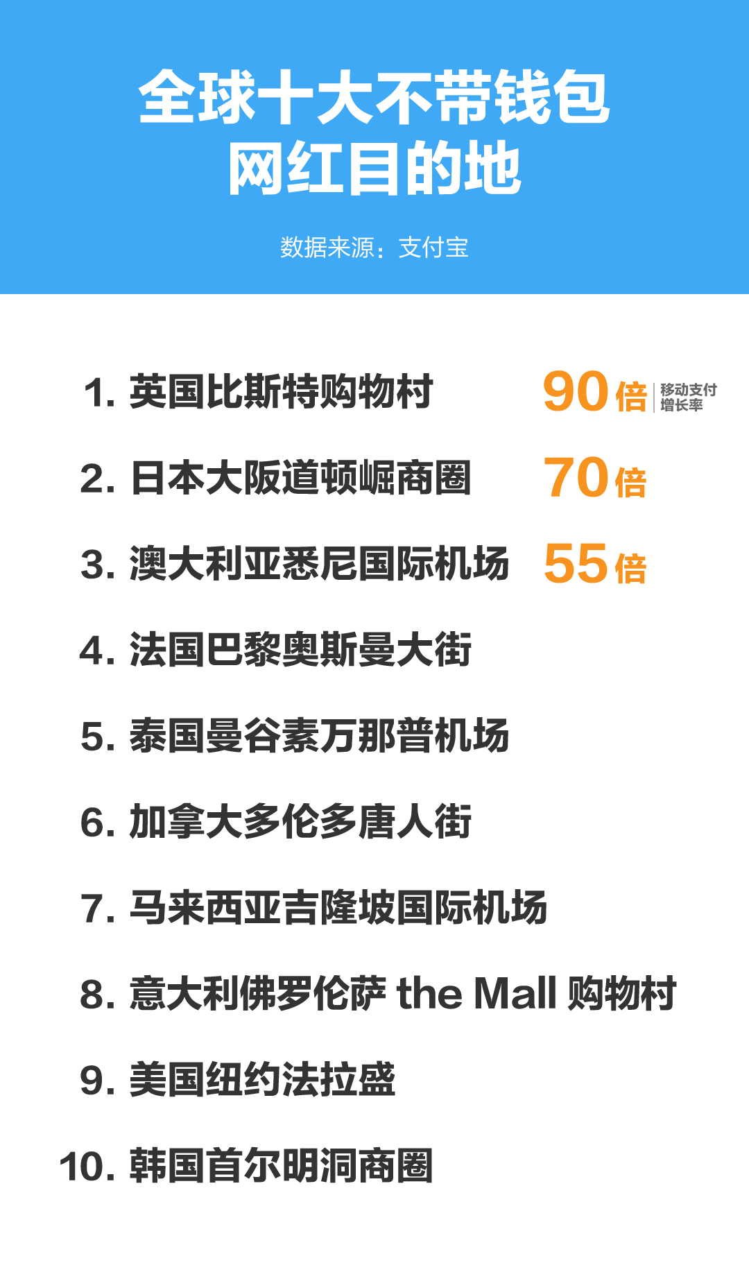 10月7日,支付寶發(fā)布今年十一黃金周中國(guó)人境外消費(fèi)數(shù)據(jù),全球十大“不帶錢包網(wǎng)紅目的地”同時(shí)出爐。數(shù)據(jù)顯示,中國(guó)人境外消費(fèi)升級(jí)的趨勢(shì)顯著,全球各地迎來(lái)移動(dòng)支付熱潮。其中,英國(guó)比斯特購(gòu)物村的移動(dòng)支付筆數(shù)同比增長(zhǎng)了90倍,日本大阪道頓崛商圈增長(zhǎng)70倍,澳大利亞悉尼機(jī)場(chǎng)增長(zhǎng)55倍。
