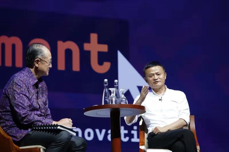 世界銀行行長(zhǎng)金墉和阿里巴巴董事局主席馬云進(jìn)行“數(shù)字平臺(tái)和創(chuàng)新如何改變發(fā)展中國(guó)家未來(lái)”的對(duì)話(huà)