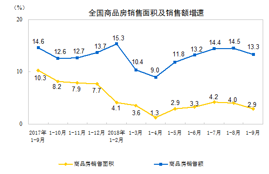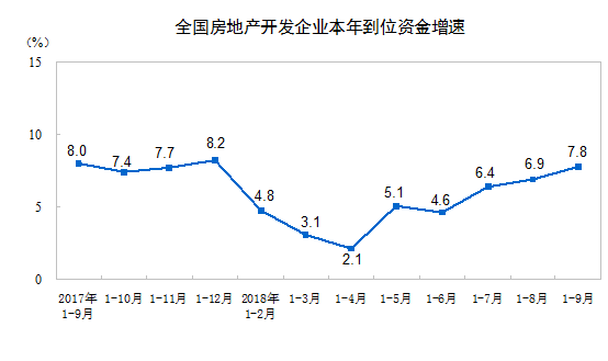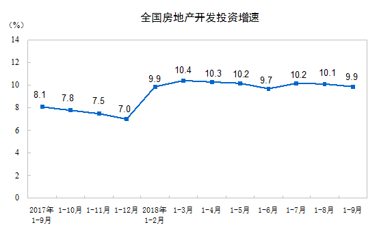 央廣網(wǎng)北京10月19日消息,國家統(tǒng)計(jì)局今日發(fā)布2018年1-9月份全國房地產(chǎn)開發(fā)投資和銷售情況。數(shù)據(jù)顯示,2018年1-9月份,全國房地產(chǎn)開發(fā)投資88665億元,同比增長9.9%,增速比1-8月份回落0.2個百分點(diǎn);商品房銷售面積119313萬平方米,同比增長2.9%,增速比1-8月份回落1.1個百分點(diǎn);1-9月份,房地產(chǎn)開發(fā)企業(yè)到位資金121882億元,同比增長7.8%,增速比1-8月份提高0.9個百分點(diǎn)。