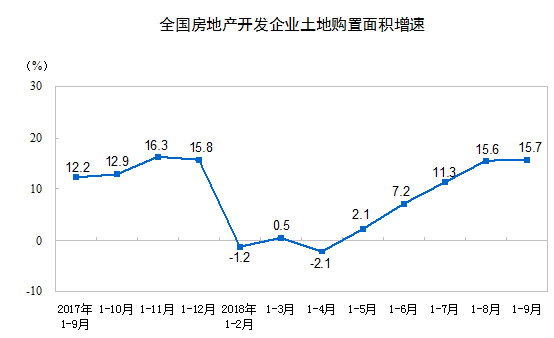 1-9月份,房地產(chǎn)開發(fā)企業(yè)土地購置面積19366萬平方米,同比增長15.7%,增速比1-8月份提高0.1個百分點(diǎn);土地成交價款10002億元,增長22.7%,增速回落1個百分點(diǎn)。