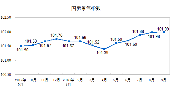 9月份,房地產(chǎn)開發(fā)景氣指數(shù)(簡稱“國房景氣指數(shù)”)為101.99,比8月份提高0.01點(diǎn)。