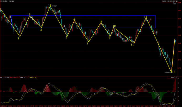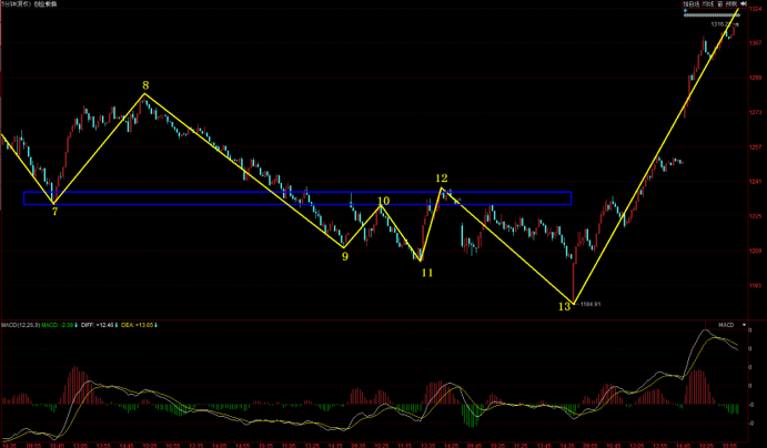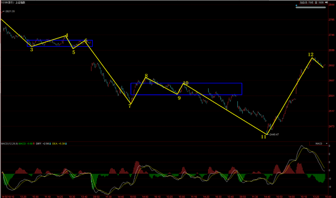 今天市場在券商股的帶領(lǐng)下,上證指數(shù)出現(xiàn)了近期比較有力度的反彈,出現(xiàn)百點長陽。經(jīng)過今天的大漲之后,后期指數(shù)該如何演變,我們不妨結(jié)合具體走勢一起來分析下來。對于19日的絕地反擊,我們之前解盤中也分析過,5分鐘10-11向下力度出不來,形成背馳,那么就有可能被中樞拉回。很顯然上周五19日的反彈實際是5分鐘中樞背馳之后的反彈,今天指數(shù)的大漲實際是5分鐘反彈的延續(xù),目前11-12這筆反彈力度直接突破了7-8中樞,目前看來指數(shù)5分鐘上漲線段并沒有結(jié)束,接下來5分鐘走勢存在兩種走法,一種是構(gòu)筑一個5分鐘上漲中樞,還有一種就是明天5分鐘繼續(xù)向上,形成5分鐘盤背,那么就有可能形成5分鐘下跌線段的調(diào)整。