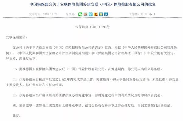 安聯(lián)集團(tuán)表示,預(yù)計(jì)安聯(lián)(中國(guó))保險(xiǎn)控股將在2019年正式成立,并將在中國(guó)相關(guān)監(jiān)管機(jī)構(gòu)的指導(dǎo)和支持下,積極完成公司設(shè)立所需的各項(xiàng)籌備工作。作為100%外資的保險(xiǎn)控股公司,安聯(lián)集團(tuán)將依托中國(guó)政府近期出臺(tái)的一系列擴(kuò)大對(duì)外開放、鼓勵(lì)外資金融機(jī)構(gòu)擴(kuò)大在華投資的政策,提升安聯(lián)集團(tuán)在中國(guó)擴(kuò)大投資和發(fā)展的戰(zhàn)略靈活性。