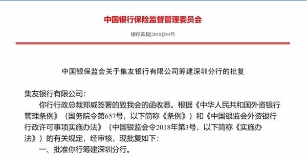 集友銀行1947年在香港注冊(cè)開業(yè),是香港第39家領(lǐng)有執(zhí)照的銀行。在對(duì)集友銀行的批文中,銀保監(jiān)會(huì)要求:自該行接到批文之日起15日內(nèi)到屬地銀行保險(xiǎn)監(jiān)督管理機(jī)構(gòu)領(lǐng)取開業(yè)申請(qǐng)表,并按有關(guān)規(guī)定開展深圳分行的籌建工作。