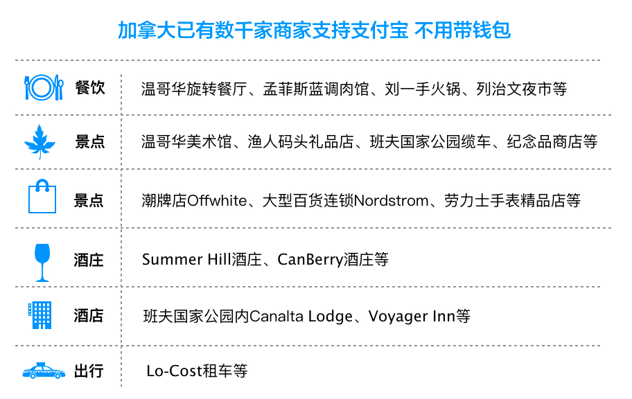 來自加拿大統(tǒng)計局的數(shù)據(jù)顯示,中國已位列加拿大第三大入境客源市場。目前,加拿大已有數(shù)千家商家支持支付寶消費(fèi),包括了餐飲、住宿、景點(diǎn)、交通等各領(lǐng)域,覆蓋了眾多旅游勝地:多倫多、溫哥華、班夫國家公園等。