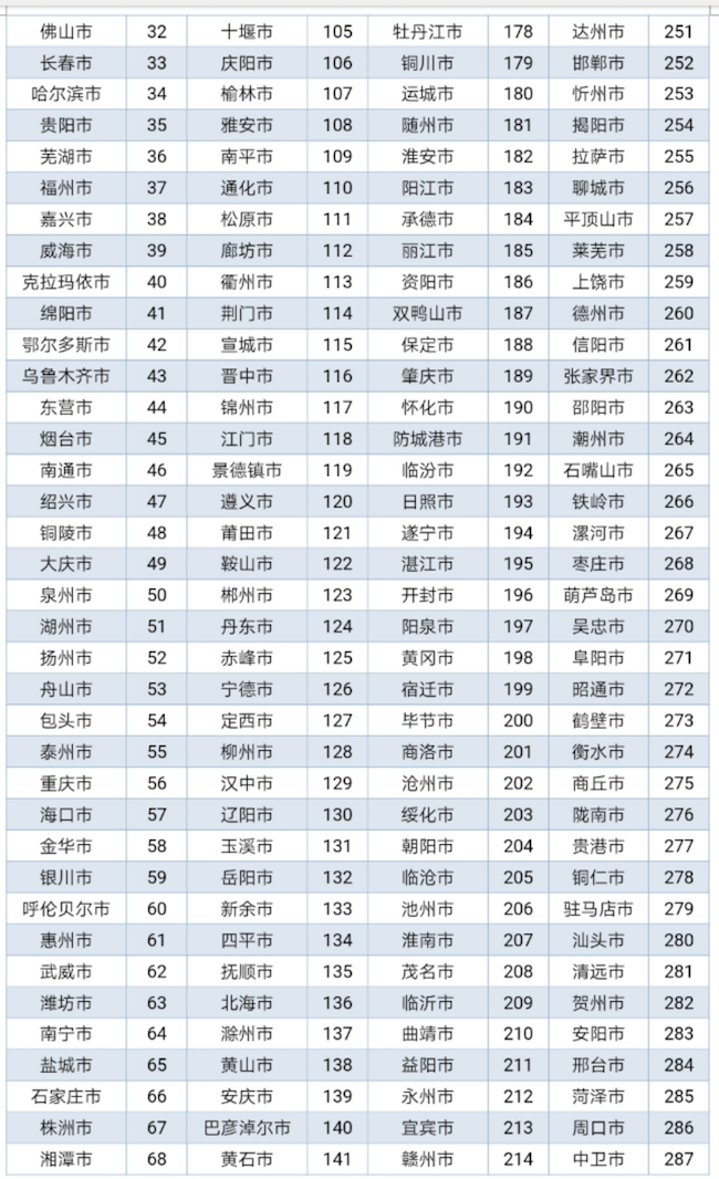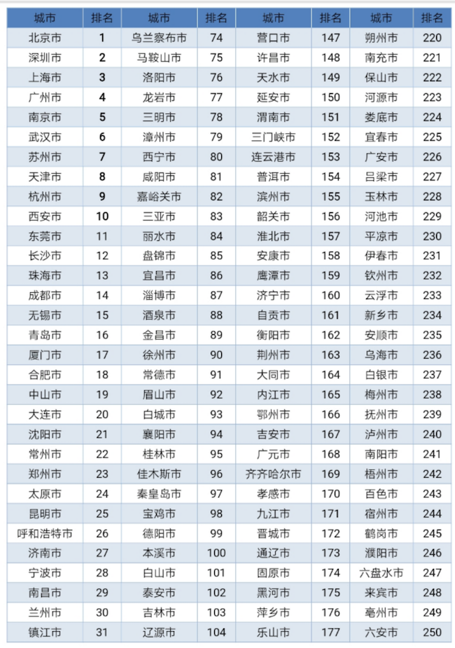 在289個(gè)參評(píng)城市中,排名前十的是:北京、深圳、上海、廣州、南京、武漢、蘇州、天津、杭州、西安。在253個(gè)一般地級(jí)市排名中,蘇州、東莞、珠海、無錫、中山、常州、鎮(zhèn)江、佛山、蕪湖、和嘉興位列前10。