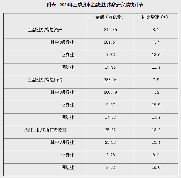初步統(tǒng)計,2019年三季度末,我國金融業(yè)機(jī)構(gòu)總資產(chǎn)為312.46萬億元,同比增長8.1%,其中,銀行業(yè)機(jī)構(gòu)總資產(chǎn)為284.67萬億元,同比增長7.7%;證券業(yè)機(jī)構(gòu)總資產(chǎn)為7.83萬億元,同比增長13.6%;保險業(yè)機(jī)構(gòu)總資產(chǎn)為19.96萬億元,同比增長11.7%。