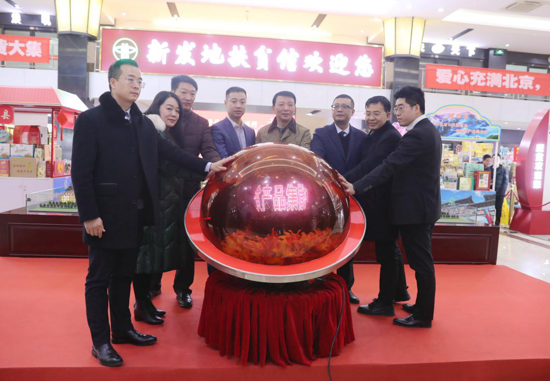 啟動(dòng)儀式上,與會(huì)嘉賓共同按壓水晶球,隨著水晶球上文字的轉(zhuǎn)動(dòng),標(biāo)志著新發(fā)地扶貧產(chǎn)品集散中心正式啟動(dòng)。儀式結(jié)束后,與會(huì)嘉賓在張?jiān)铝盏呐阃,參觀了新發(fā)地市場(chǎng)扶貧成果展。