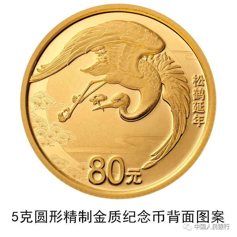 5克圓形金質(zhì)紀(jì)念幣背面圖案為松、鶴、靈芝、云紋等組合圖案,并刊“松鶴延年”字樣及面額。