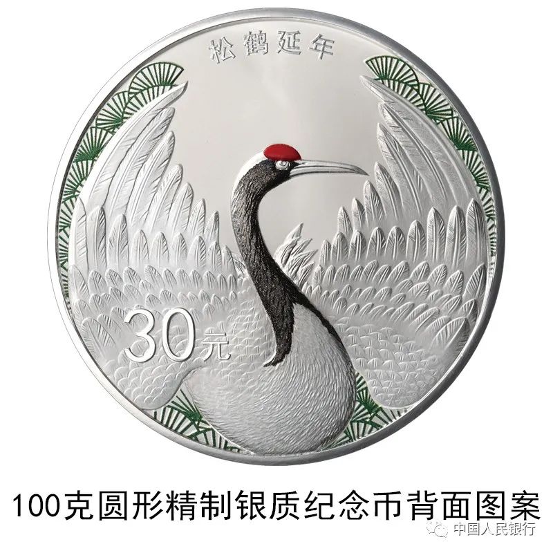 100克圓形銀質(zhì)紀(jì)念幣背面圖案為鶴與松枝等組合圖案,并刊“松鶴延年”字樣及面額。