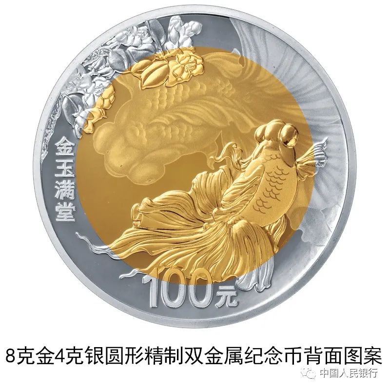 8克金4克銀圓形雙金屬紀(jì)念幣背面圖案為金魚與海棠花等組合圖案,并刊“金玉滿堂”字樣及面額。